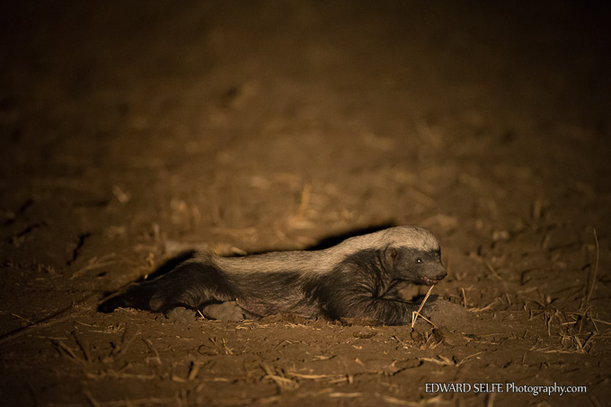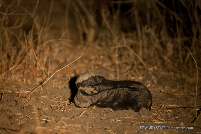 We followed the lions for a while, and they startled a few terrified bushbuck, but didn’t catch anything. So we returned to camp, searching for nocturnals on the way back. Not far out from the camp, we saw a Honey Badger nearby the road…..and it didn’t run away. Most unusual for these creatures. We approached slowly and found that it was feeding on the first in a clutch of dung beetle larvae that it had located underground. It was digging up the dung balls, biting into the hard out casing and eating the larva inside. While we watched, it made 3 trips to the hole, brought out a ball, and then lay down to eat the contents. I had never seen such a relaxed Honey Badger, and I guess it was just keen not to give up its latest stash.