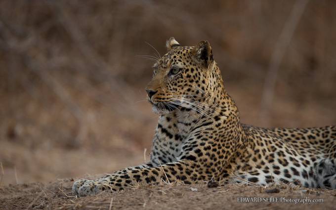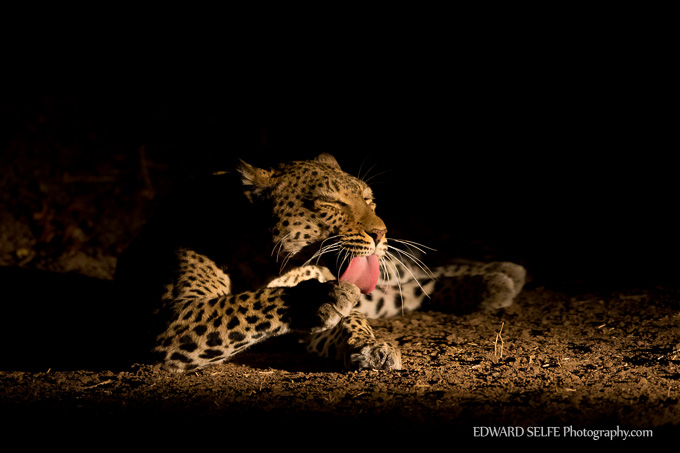 We stayed with him for a long time, and then headed back to camp. On the way, we found another leopard who had just killed an impala and was out in the open, cleaning her paws. We talked about how to use another vehicle’s spotlight to get a nice side-lit effect.