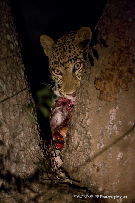 Moving on after dark, we drove through some excellent leopard habitat, and finding very little game, I suspected that the spotty cat was on the prowl. We found a large male soon after, who meandered through the grass and out of sight. We manoeuvred into a position where we might see him again, and were rewarded when he came out and sat at the base of the tree. He kept looking up into the branches, and I immediately thought that he had stashed a carcass up there. We searched but couldn’t see anything with the spotlight. I guessed he perhaps wanted to climb the tree to rest or to spot for prey so we waited. After some time, he scaled the tree with ease, and retrieved a baboon carcass that he had hidden in the first fork, where none of us could see it. He continued to feed and we used two spotlights to try to reduce the shadows of the branches.