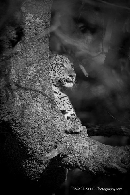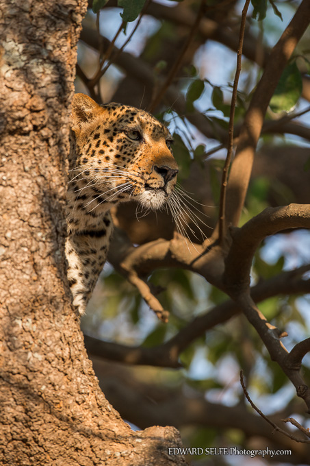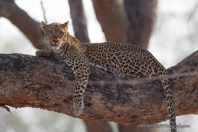 Setting off again, we returned to a thicket where I’d heard squirrels calling in the early morning, and we found a leopard in a tree!! A female who is known well to us was posing on a flat branch.