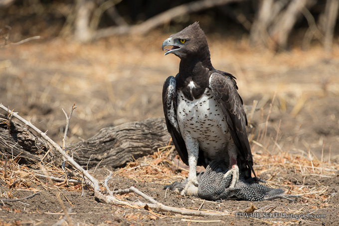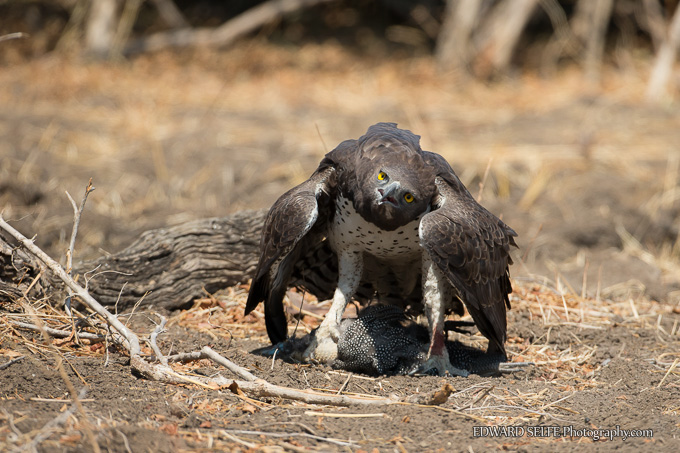 Heading back to camp for brunch, we found a Martial Eagle right on the roadside, standing guard over a freshly killed Guinea Fowl. It tried to take off and carry the prey to a tree but couldn’t get airborne so we enjoyed watching as it guarded the carcass from scavengers. We left after a while so that the eagle could feed without any distractions or unwelcome guests.