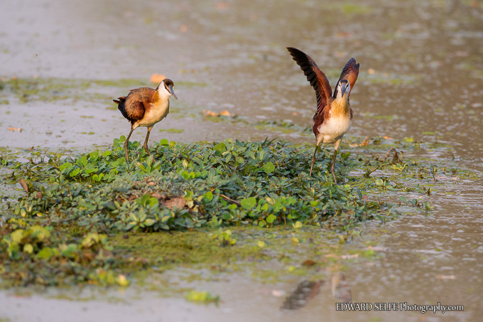 Nearby, in the water, Jacanas continued to feed as if nothing had changed.