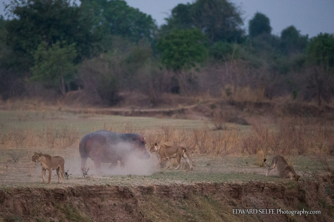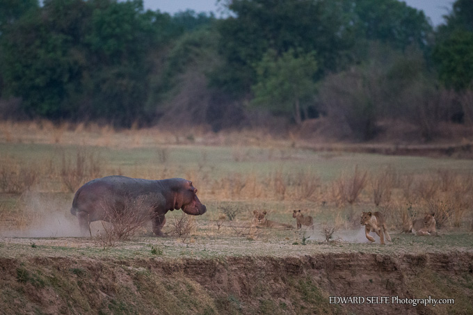 The light fell so we moved off and found a place for a break nearby. As we watched the pride from a distance, a hippo started to approach the lions, apparently unaware of their presence. We weren’t sure what would happen except that the lions didn’t switch into hunting mode, so we guessed that the hippo was a bit too big for 5 adults and a tiny cub to take on! The hippo suddenly got their wind but was too close to flee, so charged towards the lions, scattering them in all directions!