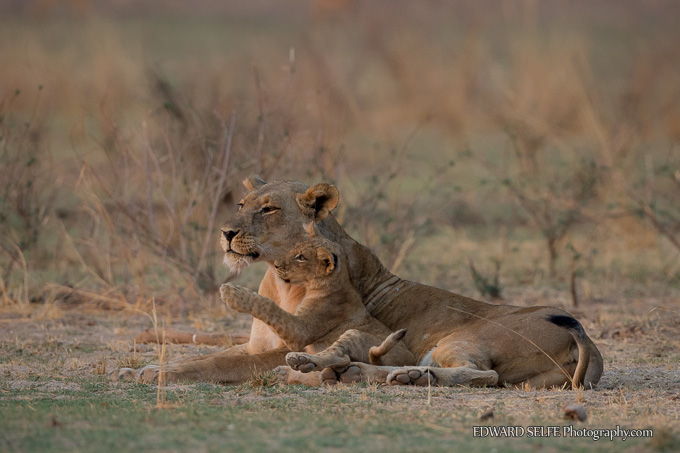 We got to the lions’ favourite hang-out and soon located the females who were resting in the bottom of a sandy channel. One of them soon came up onto the plain and her cub trailed close behind. Moving the vehicle to position ourselves for their greeting, we caught the cub as it rubbed its head against its mother’s and then lay down nearby.