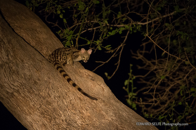 Just outside camp, a Genet watched us from a tree, before hopping down to begin a night of hunting.