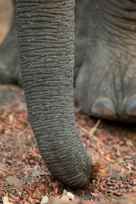 We set out and soon came across a bull elephant hoovering up Tamarind leaves near the road. I drove in very close, carefully checking the wind and moving quietly so as not to alarm him. We managed to compose some fun abstract body shots and then he moved away and reached into a tree allowing us to get the whole of him in the frame!