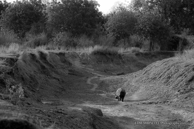 There was a small amount of water in the bottom of one of the dry channels and a hippo emerged as we drove up. He wasn’t in a hurry and shambled off down the gully, giving us time to compose a shot with the pathway in front and behind.