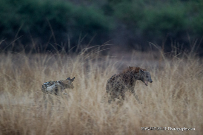 Not deterred, they decided to take out their frustration on a hyaena, who yelped and ran away as the dogs nipped at his heels.