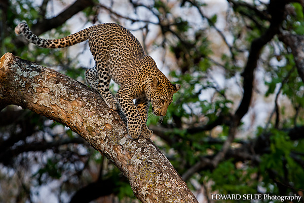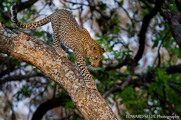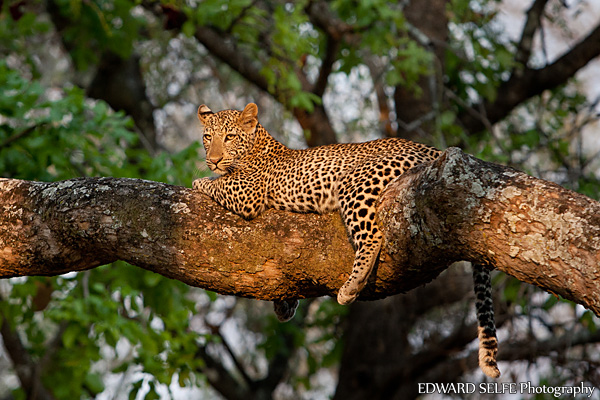 The leopard climbed the tree and looked for a place to lie which was nice and flat. The branch was largely in the shade, but there was a small patch that was in direct golden sunlight and it was here that the leopard chose to lie. 10cms either way would have ruined the effect!