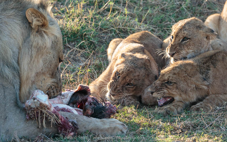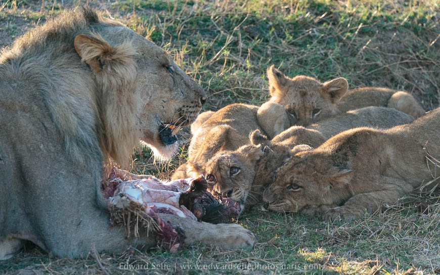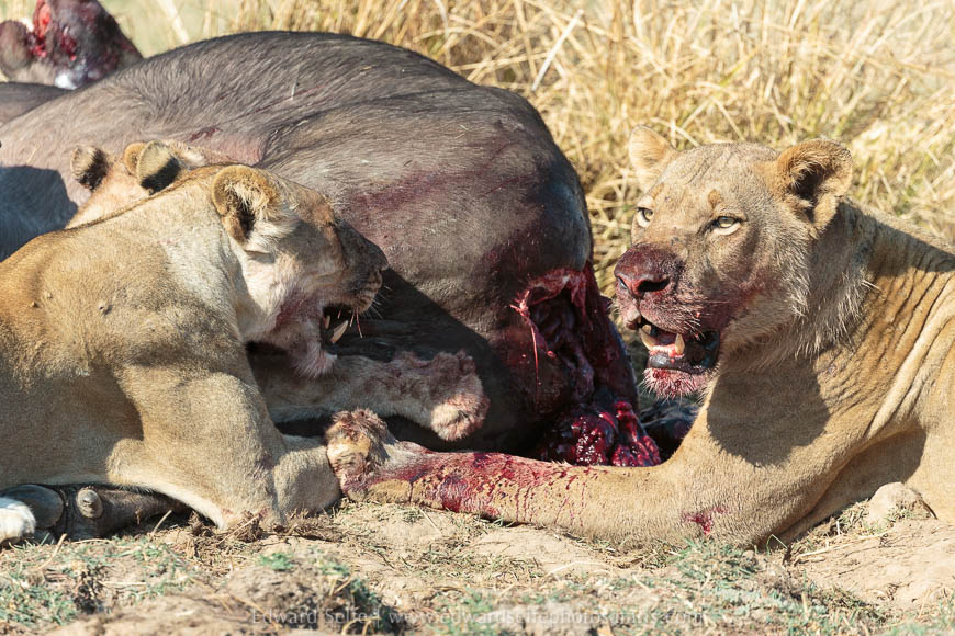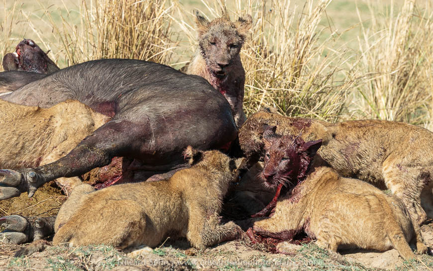 The lionesses caught their breaths and looked around nervously expecting the males to rush in and dominate the kill. Fortunately, the males were full from the first buffalo kill of the day, and showed almost no interest in the new carcass. After the situation had calmed down and no other lions or scavengers had appeared, the lionesses called the cubs and they joined the feast.
