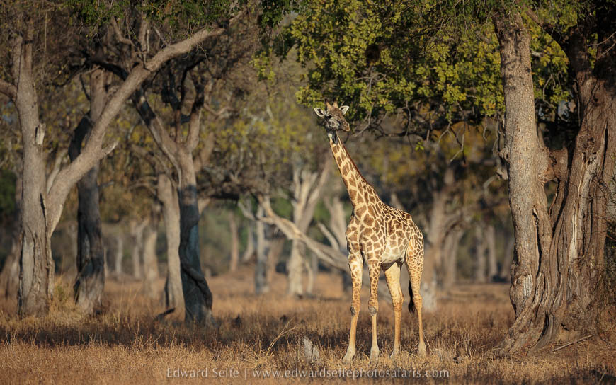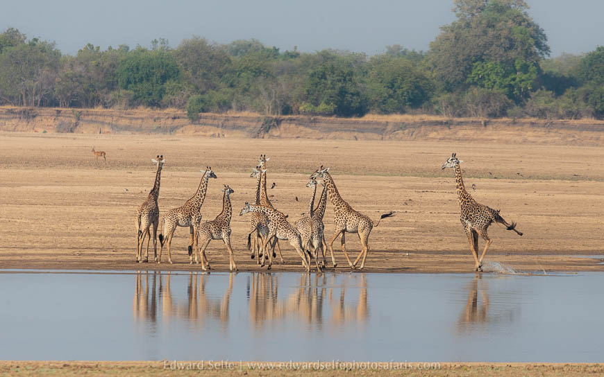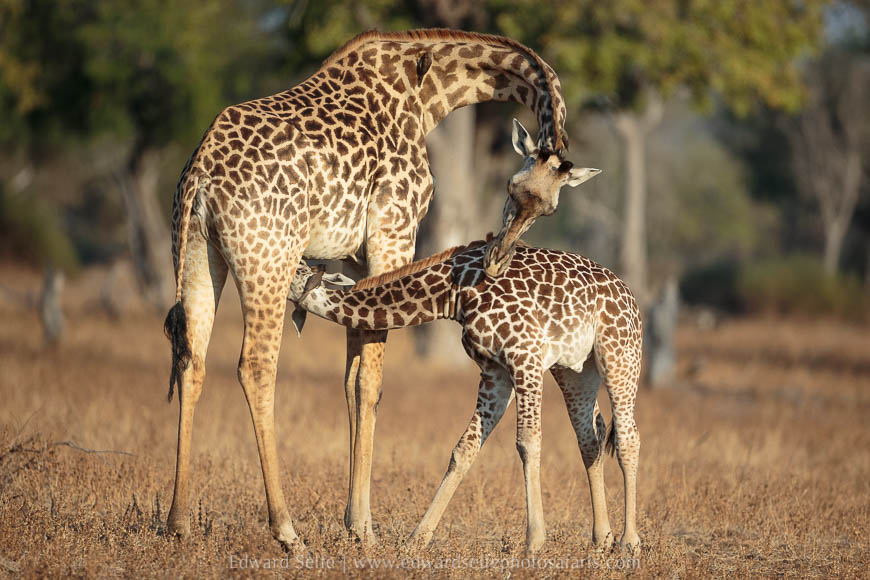 With this in mind, we went in search of suitable subjects for the stunning morning light that was building up after the brief honey badger encounter. Almost immediately, I spotted a chance for a long-range shot of elephants drinking at Lunga Lagoon, and this was quickly followed by wonderful time with a large family of giraffes who are often found between Lunga and mwana Lunga lagoons. They have 4 young calves and there is always interaction between the youngsters and the females. We approached carefully and waited in a spot where the background was good.