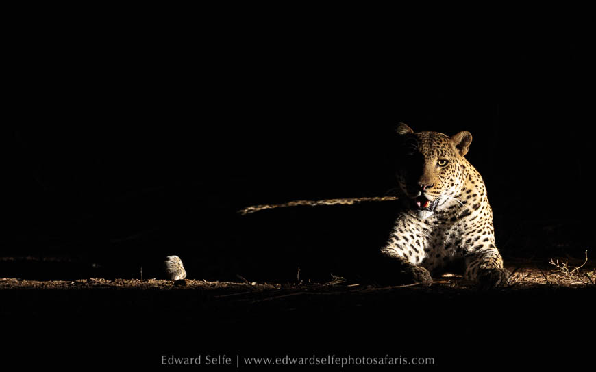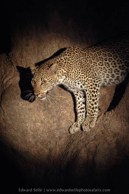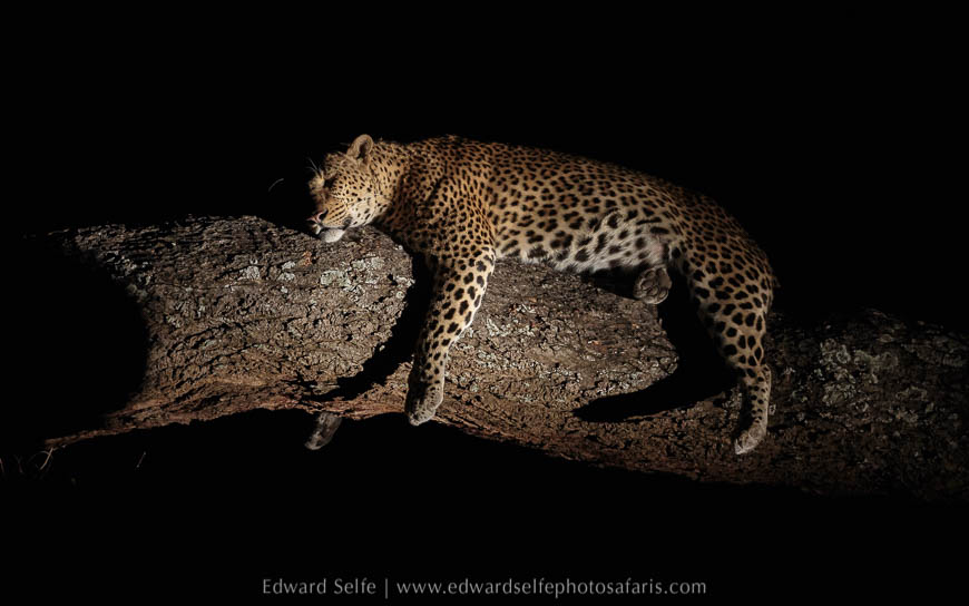 We spent over an hour with him and when another vehicle arrived, we used their spotlight to sidelight him on a branch. We were all lined up, and we only needed him to lift his head for a second to complete the shot….he didn’t! Such is wildlife photography! But when he had woken up, he descended and lay on the ground at the base of the tree (which is more comfortable with a full belly!) and we could create a similar effect there.