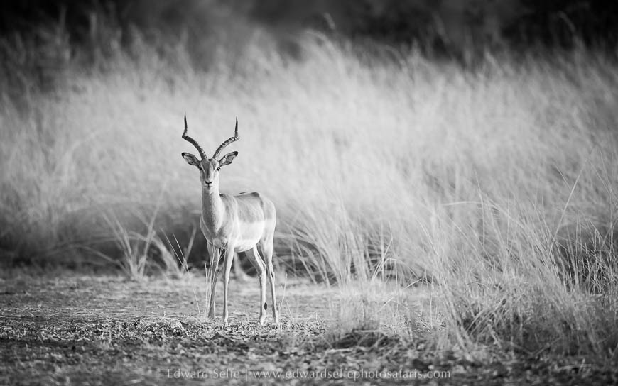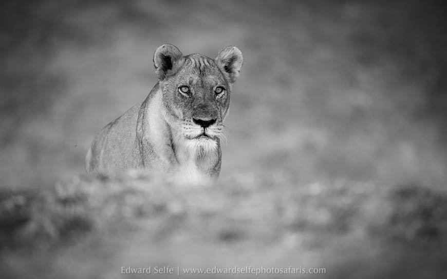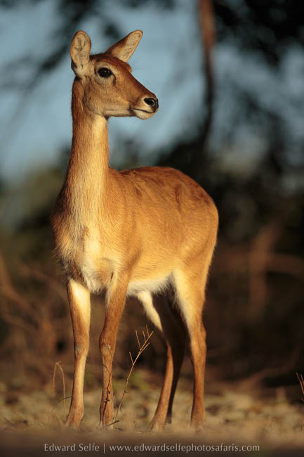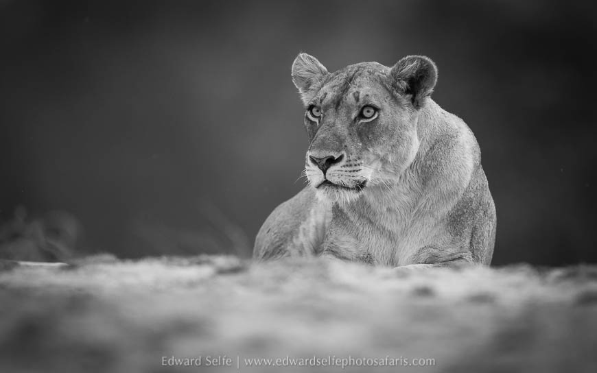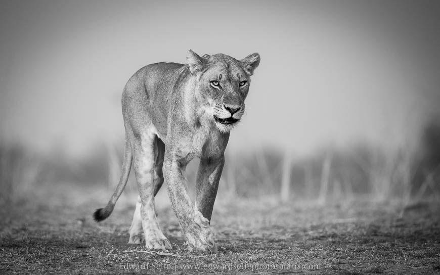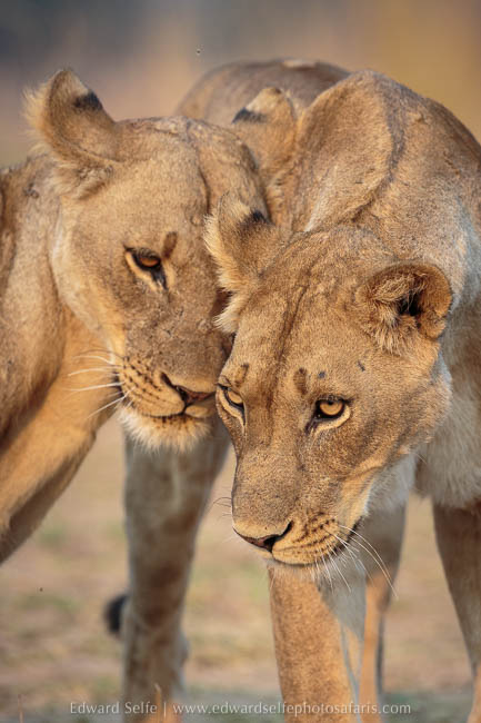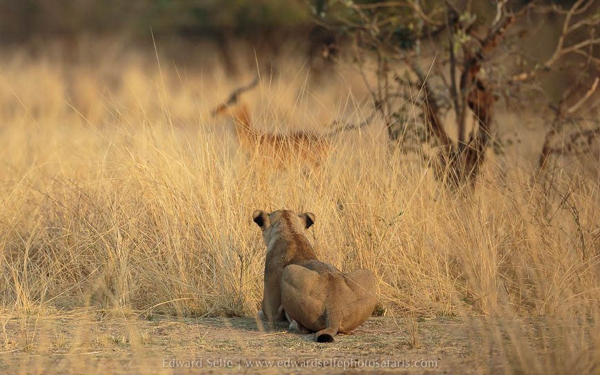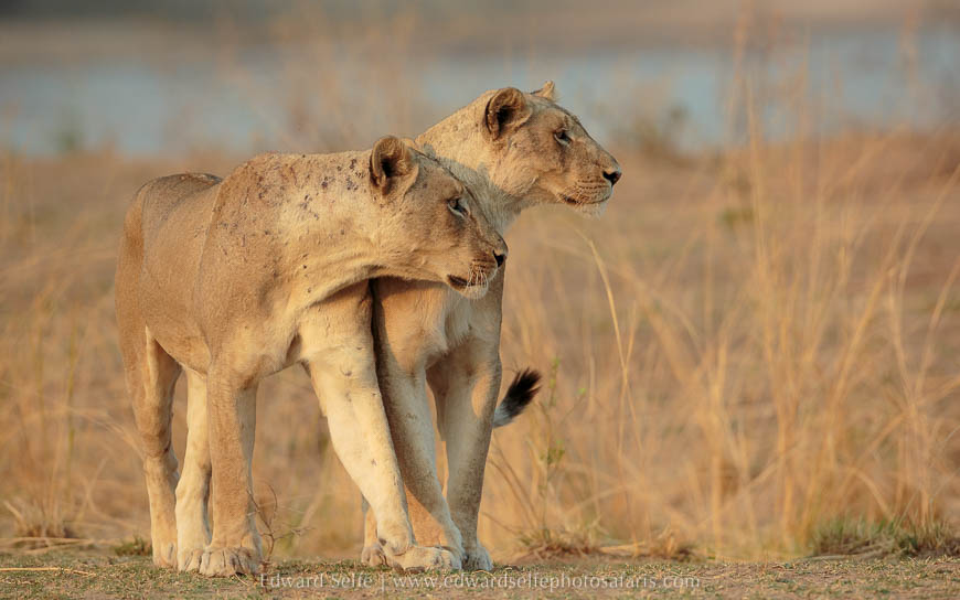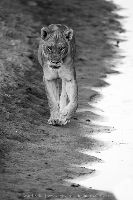 Initially the lions simply rested in the shade but they soon rose and walked along the bank towards a gully where they could get to the river. We moved in front and captured shots as they approached us across the open ground with warm sunlight on their tawny coats. As the light started to dim, they lifted their heads and started to eye up the puku and impala feeding on the grassland nearby, and I knew that we would have a hunt the moment darkness fell.