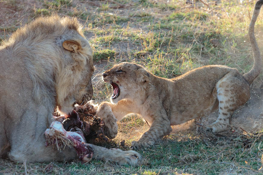 They appeared to be heading to the river, and my thoughts were confirmed when I heard the males call loudly several times from the direction that they were heading. We drove quickly around and found an amazing scene. The males were feeding on a freshly-killed buffalo calf, and the cubs were all crowded around waiting for their turn. Male lions dominate on carcasses, the “lion’s share” being the fee they take for protecting the area and keeping the females and cubs safe from intruding males. As the cubs inched closer, the males continued feeding and then swiped at the youngsters with no warning at all! They were up against a small bluff meaning that the only available angle was shooting in to the light, but we all got some good shots and we enjoyed the amazing interaction.