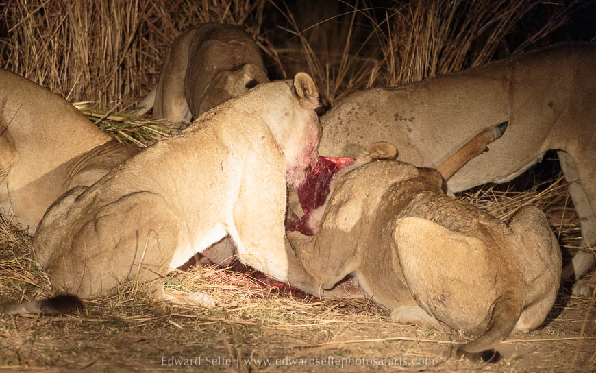 Before it was even fully dark, the pride split with the bulk remaining on the river bank while two lionesses took a wide line around the antelope herd and started to push them back towards the rest of the pride. It was fascinating to watch the unspoken coordination between them. We had all the lights turned off, but we could hear the antelope starting to get twitchy. As the first lionness charged, we waited and then turned on a red spotlight so that we could just make out the lions and antelope running in a melee across the plain. We waited again until we heard the unmistakable sound of lionesses grunting and grumbling and we knew that they had caught an antelope! We arrived as the first 3 lions were starting to feed and the remaining 3 joined moments later. With a small carcass to share, the competition between them was intense and photos were almost impossible. We took some videos instead!