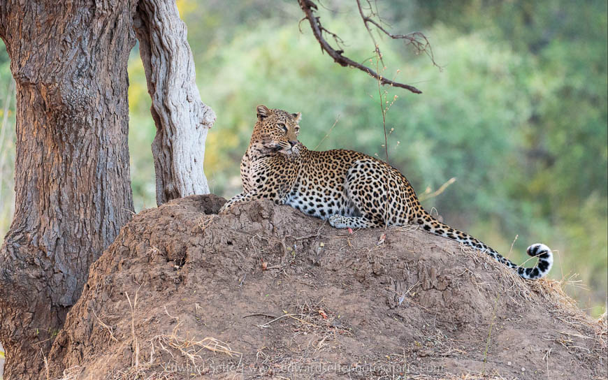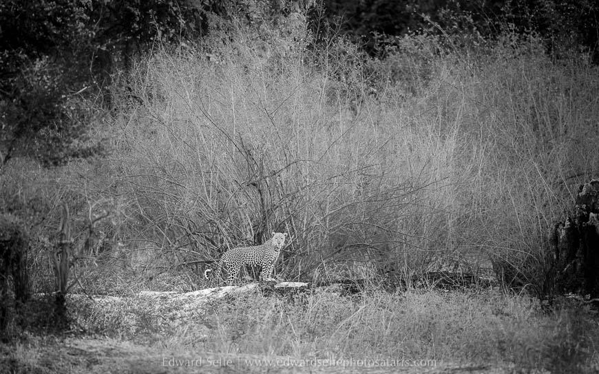 My plans to return to the area and track down Olimba the following morning were interrupted by the sound of a leopard calling very close to camp during breakfast on the river bank. We finished our coffee and went out in search of the commotion. It didn’t take me long to track down a female leopard who we regularly see in the riverine forest close to Nsefu Camp. We followed her for a short distance but the baboons were also barking elsewhere. I checked around and we found that she was following a male leopard! A mating pair! The male was shy, but we managed to get a great view of him in the distance. As the female followed to catch up, we lined the two of them up and snapped two in the same frame. Little did we know that this was not the only time we would have 2 leopards in one frame.