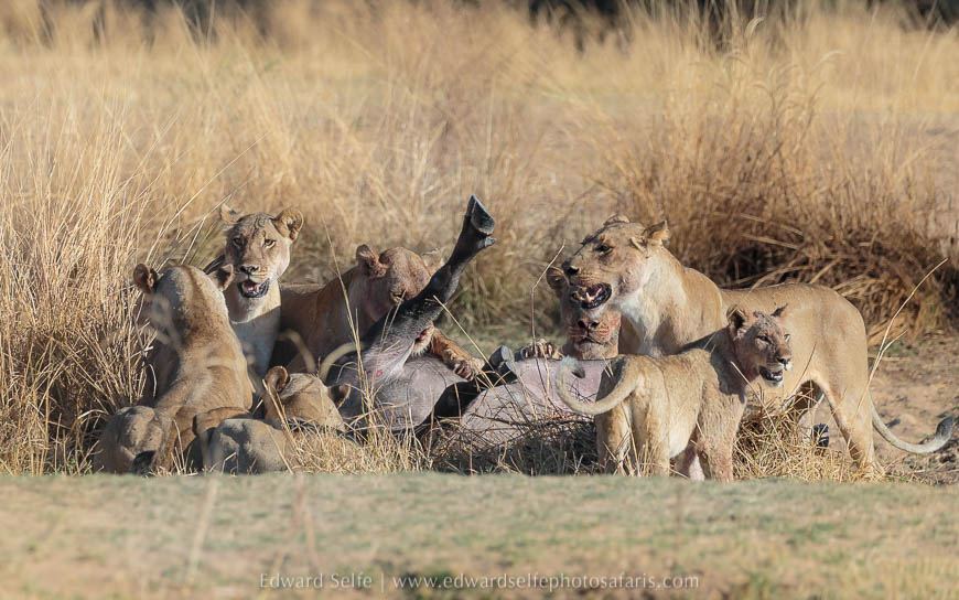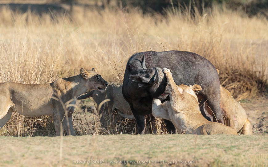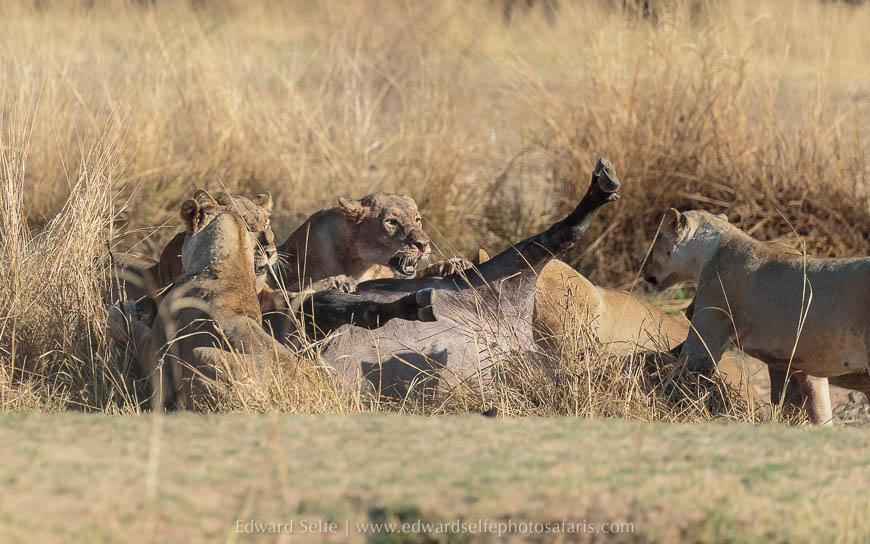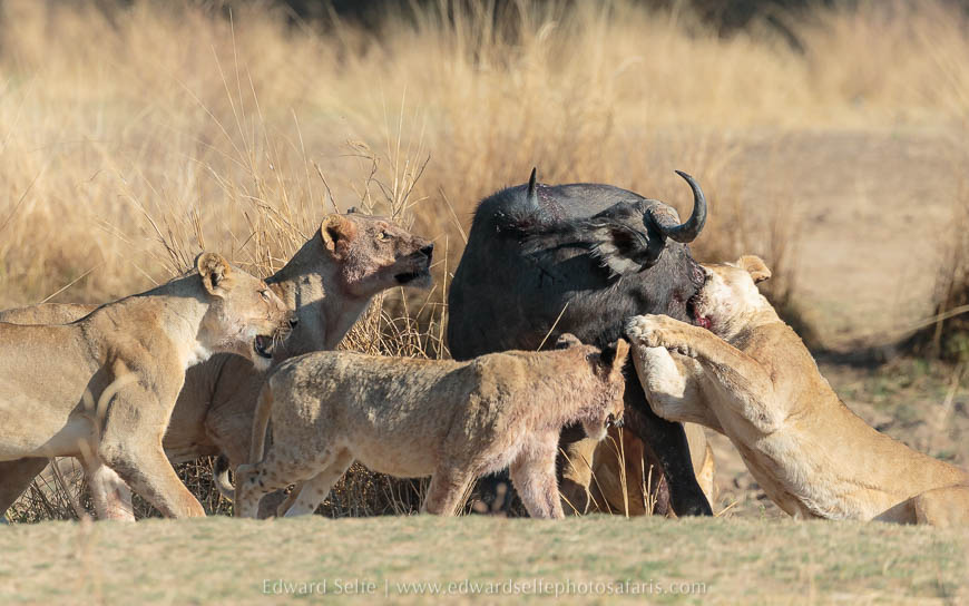 It is quite rare to see a lion kill in full daylight, and even more so to see it out in the open. I had been expecting a long battle, but the buffalo was a cow rather than a bull, and much weakened by the nutritional compression of the dry season’s peak. Watching how the lions worked together to fell a large, dangerous creature was incredible, and I am grateful that the process was as brief as could be hoped for. No one likes to see an animal suffer, but lions can be inadvertently cruel in their attempts to kill without getting injured themselves. It seems the Nsefu pride were highly professional on this occasion.