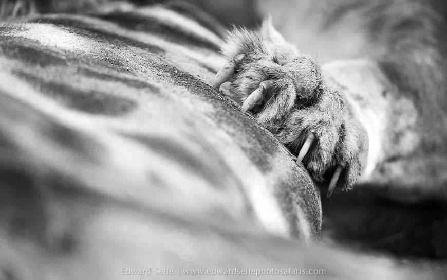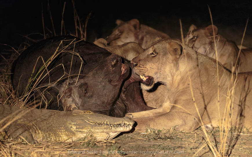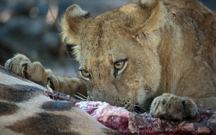 There are always a lot of lions at Lion Camp (as you would expect!) but it was actually a huge male leopard who gave us our best sighting of the first afternoon. After honing our skills on some kudu, buffalo and guinea-fowl, we found him finishing off an impala carcass that he had killed perhaps 36 hours before. As the light was failing, we augmented the natural light with a soft spotlight and enjoyed the feeling of being in the presence of Tyson, the largest leopard in the area.