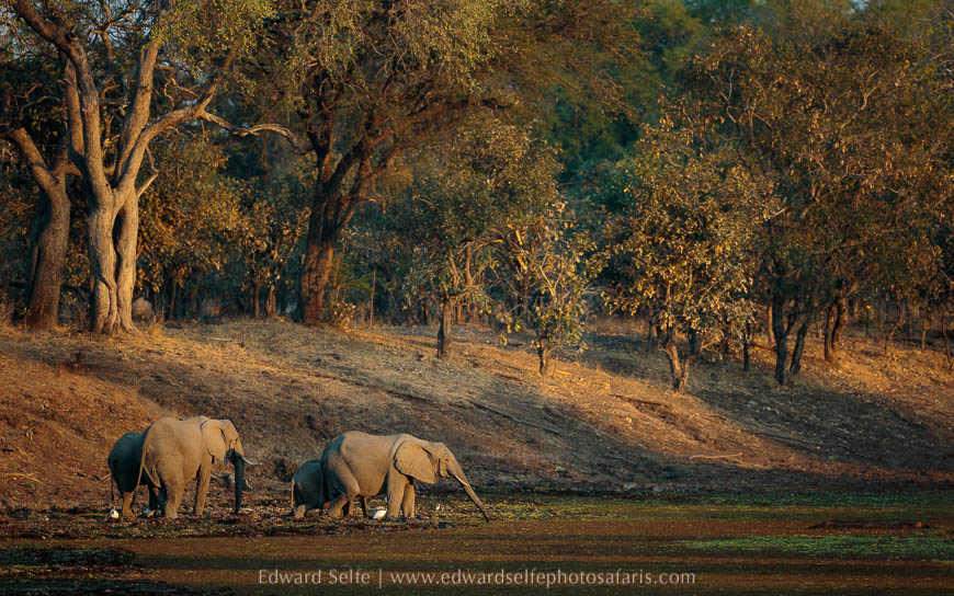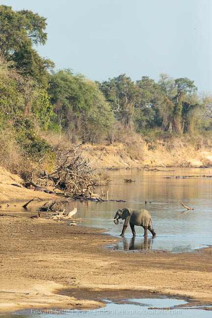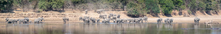 After spending some time in the massive ebony grove south of Lion Camp, we went for tea-break opposite a favourite elephant river crossing and drinking point. We were disappointed to find no elephants there, but we waited while we had coffee and were rewarded with the arrival of more than 65 elephants all at the same time. As they started to emerge through the bushes, it was apparent that this was going to be something special. I outlined how to take a series of images that can successfully be stitched together in Lightroom and we then sat and watched as herd after herd descended the bank on the far side (the Nsefu Sector) and arrived at the water’s edge.