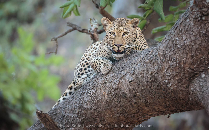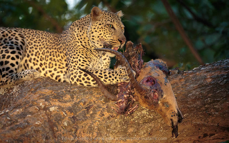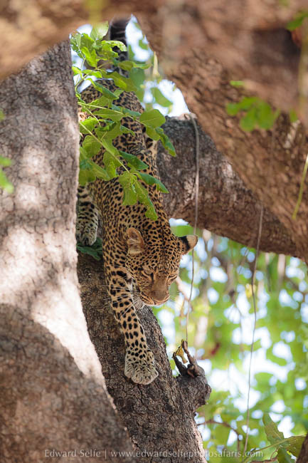 However, we did catch up with Olimba once more, much later in the morning. She was resting in a sausage tree when a puku moved under the tree to feed on the flowers. Strangely the leopard made no attempt to catch the puku, but she never took her eyes off him. When he moved away, she quickly descended and moved off; Olimba defies many beliefs about leopards by hunting in the daytime and moving large distances that are well beyond what many would consider to be a territory.