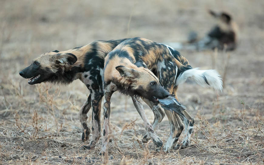 We were very excited by reports from further north that the hot springs pack of wild dogs had been seen between Tena Tena and Nsefu Camp. Dogs are always on the move, and we didn’t know when or if we might see them again so we searched for them that afternoon. It was great to see them, and we enjoyed some interesting interactions, but they spent most of the afternoon light doing simply nothing! While some packs will play, chew sticks and even chase birds, this pack of 9 males and 1 female barely moved until the light was completely gone. Just as the light was failing, the dogs rose and rushed into a bush where they killed a…..dove. Such is life on safari.