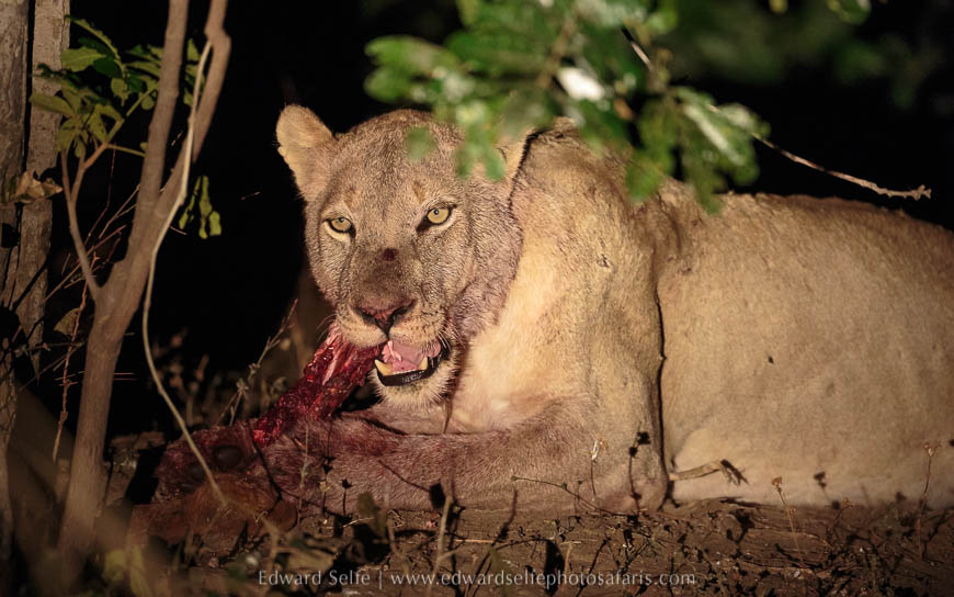 Without warning, 3 hyaenas came bursting onto the scene with an enormous noise and surprised the lions momentarily, forcing them off the kill. It was a bold move since the lions might have retaliated, but it was just enough for the hyaenas to snatch most of the carcass and rush into the bush. There followed 20 minutes of total mayhem, as lions and hyaenas ran in all directions trying to secure the scraps of what remained of the kill. After taking some photos, we simply sat in the dark, listening to the amazing sounds of competing predators all round us. Things started to settle eventually and we found one lion cowering under a bush trying to finish off the scraps of what she had managed to secure. Among two weeks of truly memorable events, this was really something that will stay with me; the noise, the dust, the audacity of the scavengers and the fact that we had seen the whole event from start to end.
