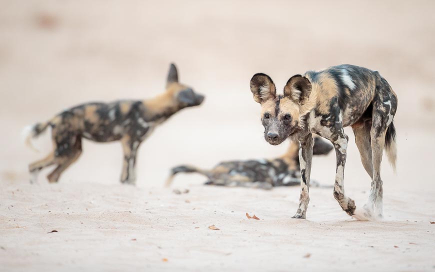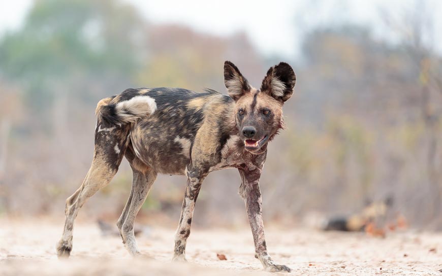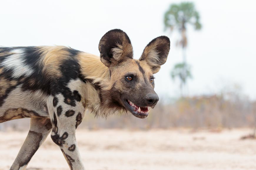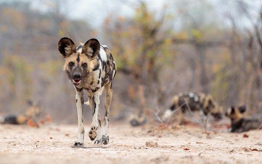 Almost before we had left camp on our first morning, we found a pack of Wild Dogs who had only recently started bringing the pups with them when they left the den to go hunting. We had been seeing the adults but not before seen the 6 pups from this year’s litter. Unfortunately the light was poor that morning, but we enjoyed a wonderful hour with them. Initially we watched from the vehicle but when they reappeared some way off in the bush we approached on foot and were rewarded with an inquisitive adult dog coming right up to us!!