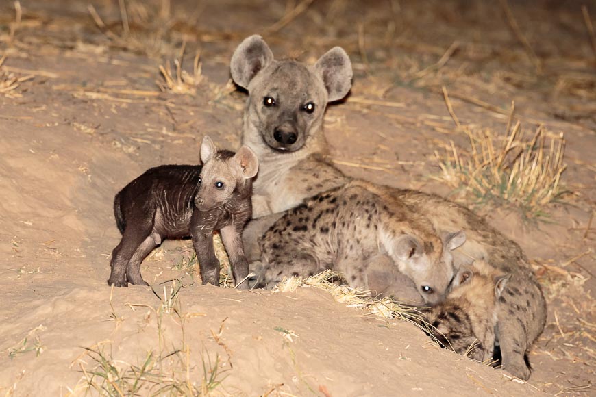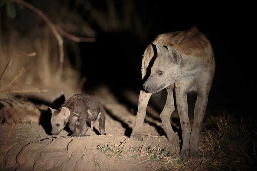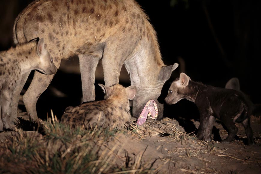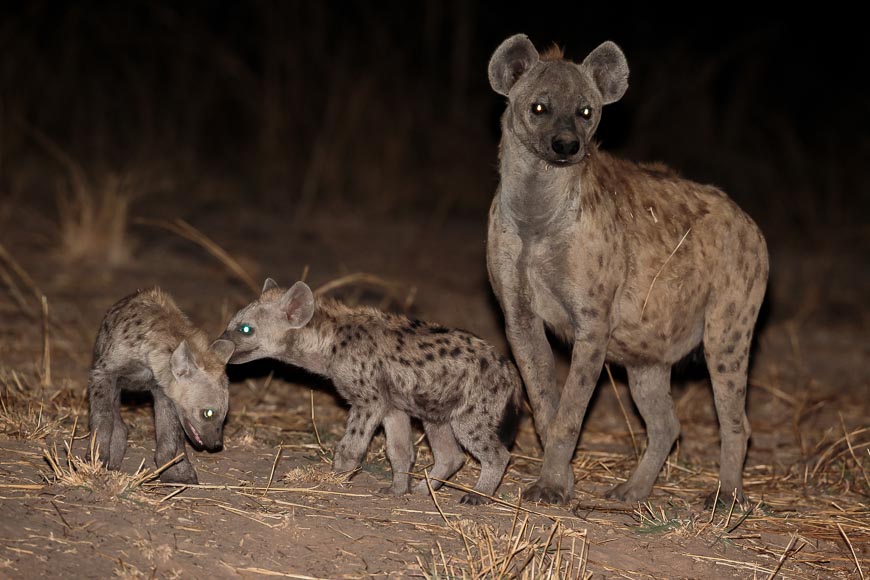That night, we visited a new hyaena den that the clan have moved into this season. There were pups of all ages and sizes and we watched for a while before deciding to turn off the spotlight for fear of attracting unwanted visitors who might threaten the pups.