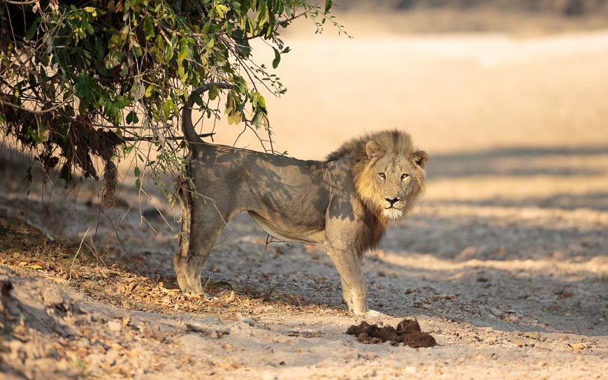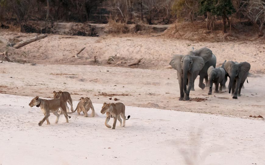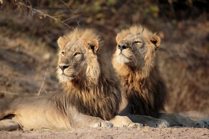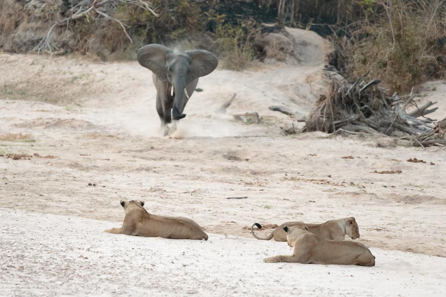 Having seen so much, we chose to explore some new areas on our final morning. The decision was a good one as we caught up with the two males from the Luwi Pride who were lounging with a female. They too were displaced by elephants (something you don’t often see twice in a week!) but returned to the same place once the elephants had moved away.