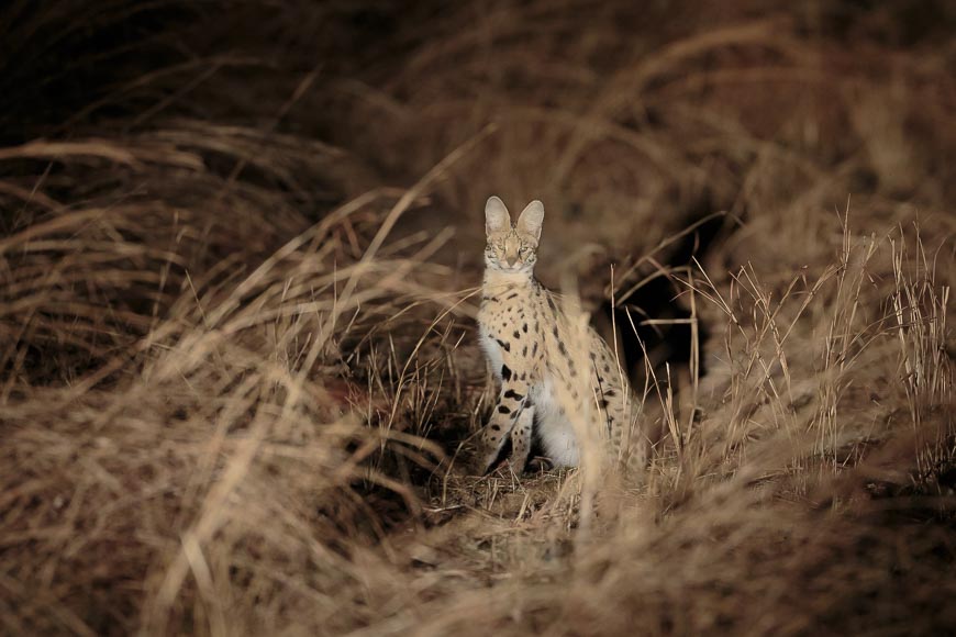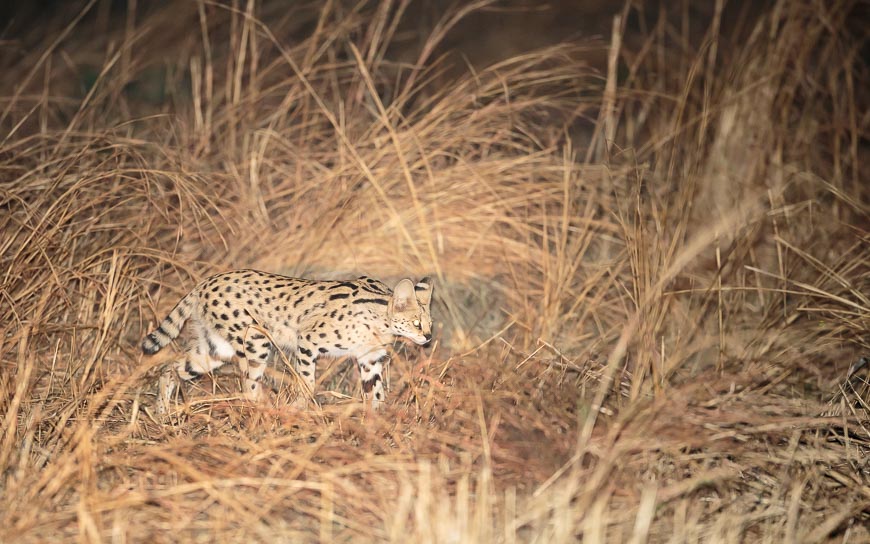 Heading home after dark, we enjoyed a wonderful serval sighting – such a beautiful cat and completely at home in the grassy habitat along the Luwi river.
