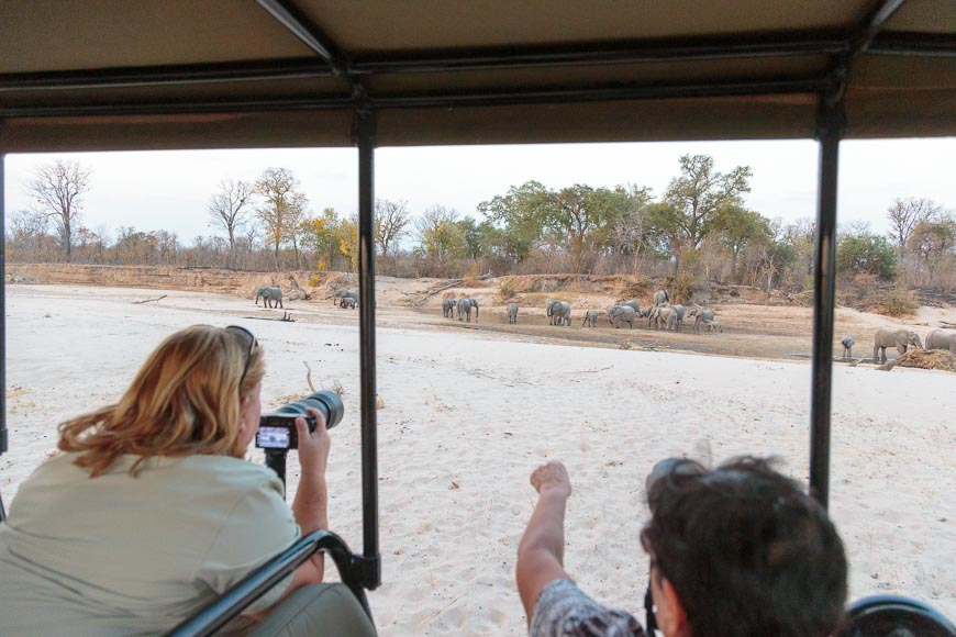 The following day, in the late evening, we spent over an hour at a waterhole that had been dominated by lions from the morning. Elephants were piling up in the bush, hoping to get access to drink, but were held back. Eventually, as it was getting dark, a brave cow brought her family out and they charged the lions, displacing them and allowing 20-30 other elephants access to the water!