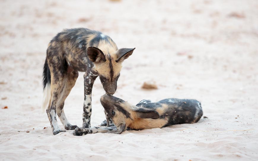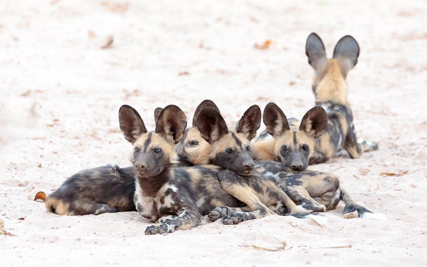 To top off a fabulous week, we found the dog pack again in the afternoon and we spent a while with them watching the pups interact and create the original dog-pile!! Then, as one, they got up and moved off to the waterhole and began to hunt in that dusk period when it’s very hard for their prey to keep tabs on all of them when they’re running around and causing maximum confusion.