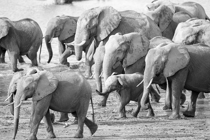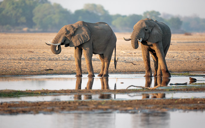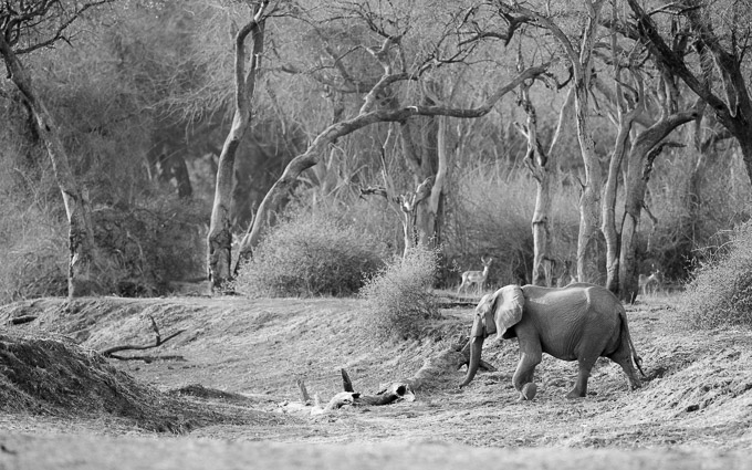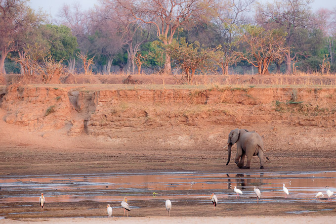 Very early the next morning, we found a bull elephant crossing the river in the pink morning light. Scattered waterbirds gave an interesting foreground as he looked for a way to climb up the other bank.