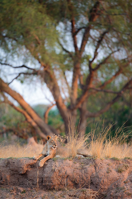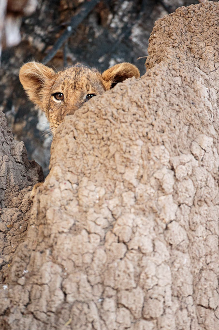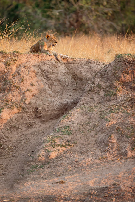 We moved on and found a small pride of lions late in the morning. There weren’t many photo opportunities so we concluded that we should return in the afternoon. Arriving late in the afternoon, we found only one of the pride remaining – one of the two smallest cubs resting on a termite mound. He seemed nervous (and good that he was as he was very vulnerable on his own) so we took some photos and left him alone.