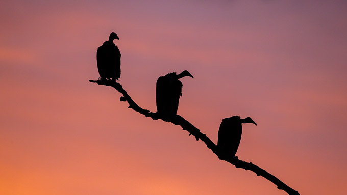 The rest of the pride had moved down onto the sand by the water’s edge in a very inaccessible place, so we didn’t have any photo chances. We decided to sit with them anyway in case they moved and gave us a chance, or in case they started to hunt. In fact, our patience was rewarded. The Hooded Vultures, who had been sitting on the sand with the lions to feed on their droppings, flew up into some dead trees at dusk. The Vultures made great silhouettes against the pink sky and we all took many shots of the characteristic shapes.