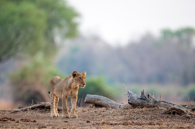After a failed attempt at ambusing some antelope, they settled down to wait for sunset when their job would become much easier. We enjoyed playing with long-lens animal-scapes (as I call them) such as this one with a hippo causeway and a lionness.