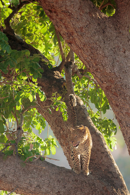 Almost as soon as the elephants had moved on, I picked up the sound of pukus alarming above us on the river bank. We followed the sound and I spotted a large leopard in a Sausage tree. He wasn’t too happy to see us and descended the tree, but didn’t rush off, allowing us some time to take photos of him in the morning light.