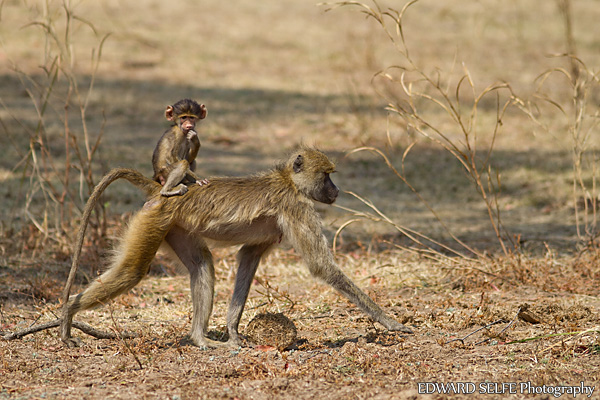 As young baboons grow up, they prefer not to hang underneath, choosing to ride shotgun, propped up on mum’s tail.