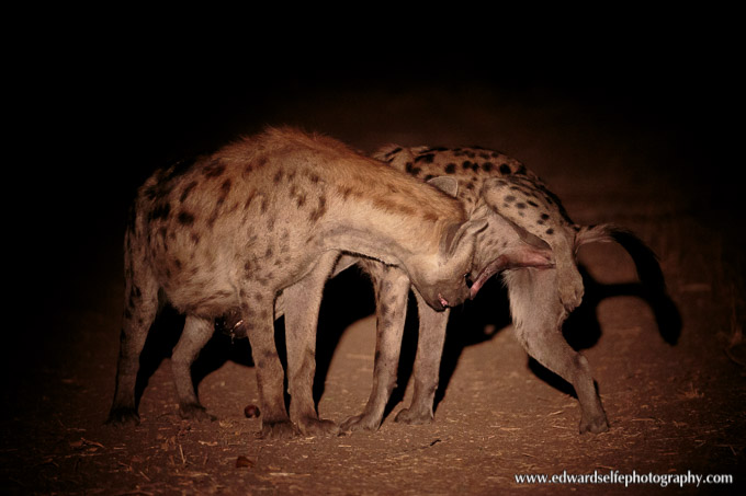We enjoyed some really interesting hyaena behaviour on our first evening. Sniffing of genitals is a standard greeting among hyaenas from the same clan. Here a female sniffs a male, and vice versa.