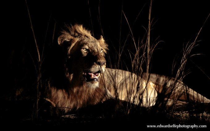 A large lion, lit by the light from a nearby vehicle allowed us some nice shots. The grass in front adds to the image I think, but would have blocked the subject if it had been lit from our spotlight or with flash. All these options are explored on a photo safari.