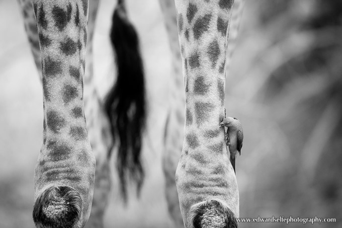 A giraffe who stood motionless by the side of the road gave us a chance to consider the callouses on his knees and enjoy the oxpecker making his living amongst the short hair.