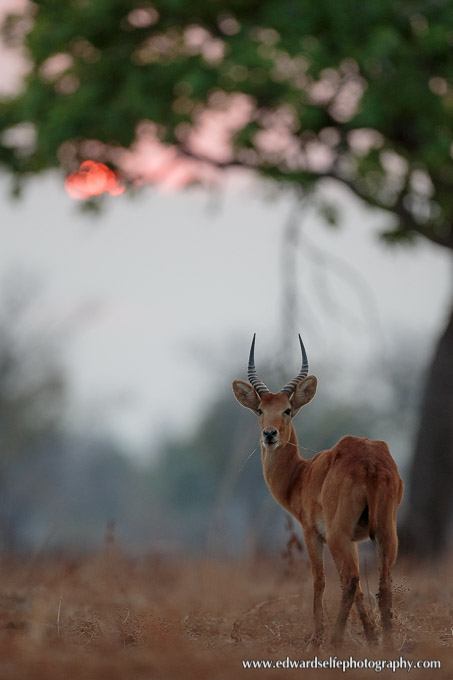 And finally, we embarked on one of my more stupid schemes! To try to get shots of the setting sun behind this puku, we lay down on the ground and crawled. I hadn’t considered how hard the ground is, and also how widespread are the rhino thistles at this time of year! We got shredded and emerged with only a couple of half-decent photos. Roger, wisely, remained on board the vehicle and simply rolled his eyes!
