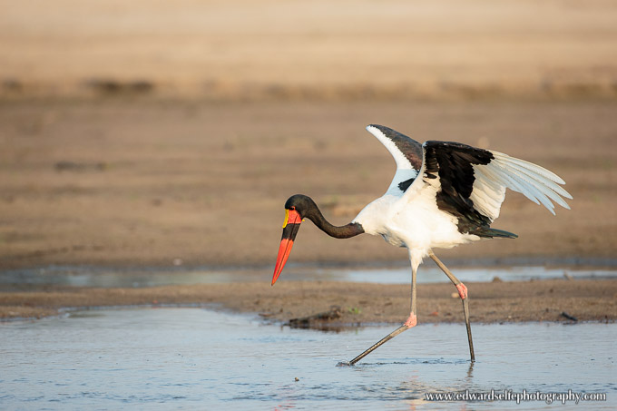 The beautiful morning light gave us great opportunities to photograph this saddle-billed stork as he hunted for insects and fish. Spreading the wings to shade the water is a behaviour most commonly seen in yellow-billed storks but this fish-attracting technique is also practiced by Black Egrets and other storks.