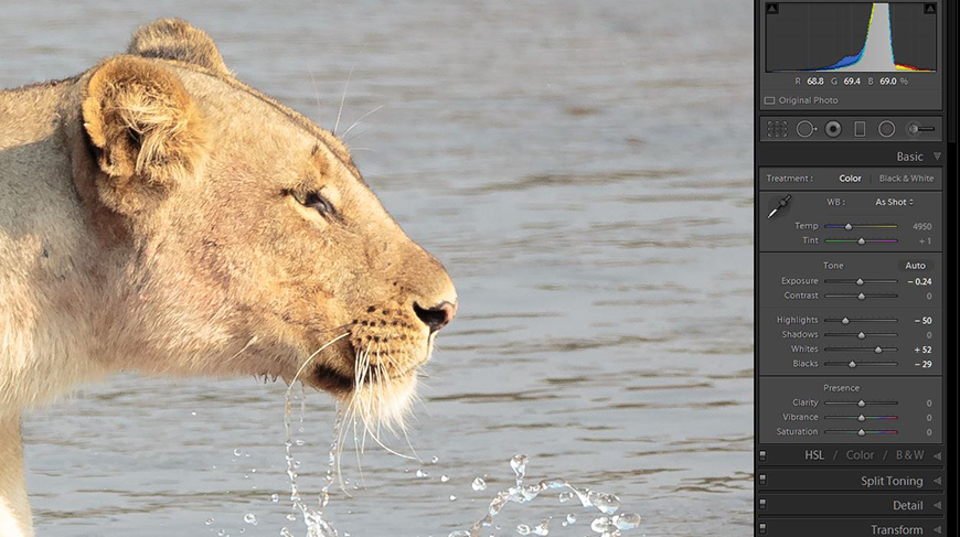 - Work in batches of images. Work on all your images of lions, and then all your images of deer, and then all your images of a landscape from a particular viewpoint. I find it very hard to keep perspective and reality when I am jumping from subject to subject, as is often the case if I work chronologically through a day’s safari images.