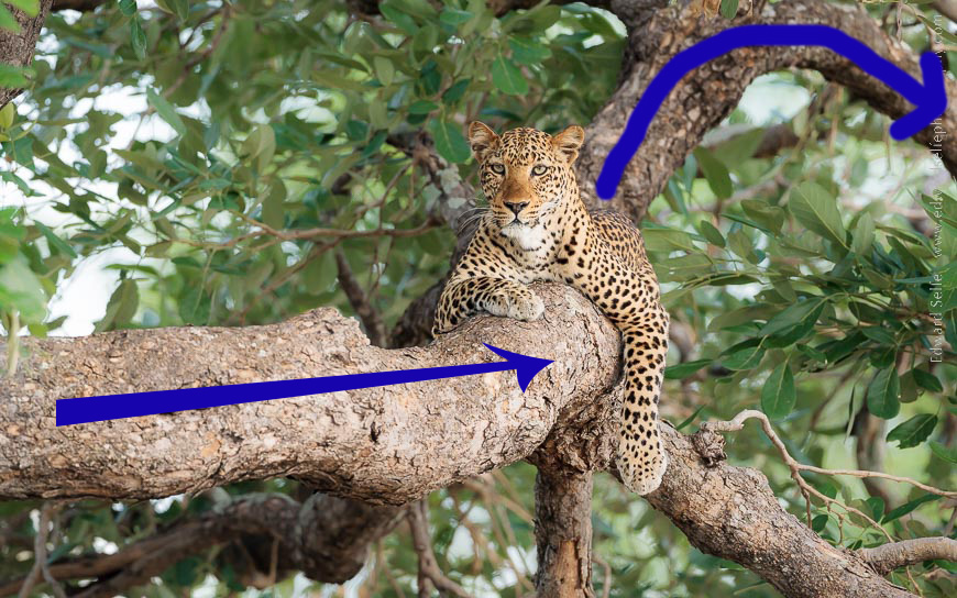 Leading lines are also a well-known compositional element, perhaps more common in landscape photography. Here, the horizontal branch leads the eye towards the leopard, and continues afterwards. It is also helpful that I was at eye level with the subject when I took the shot.