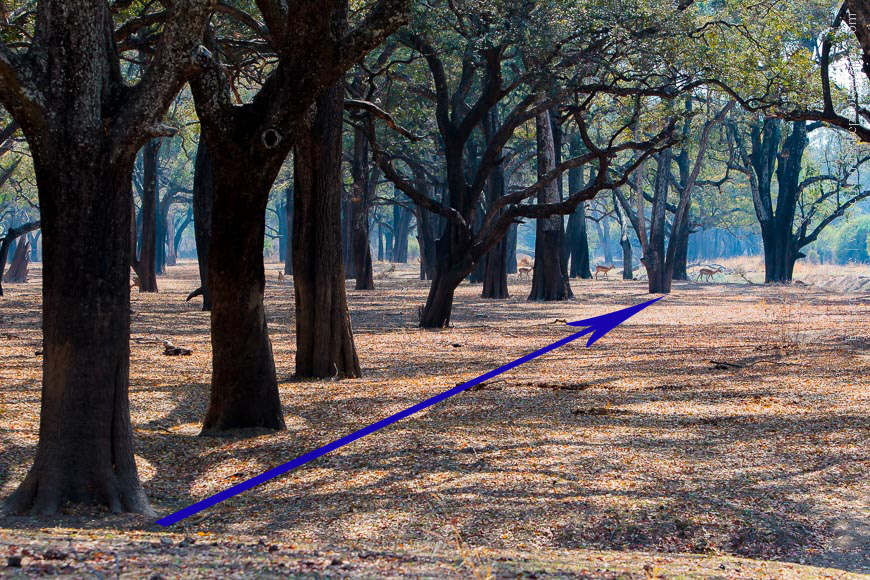 A classic leading line. Without the row of trees to draw you in, the tiny impalas in the distance would certainly be lost to the eye. The key with a successful image is that your eyes are kept interested; here the bold trees grab the viewer, but when the eyes discover the impalas, they start to find more detail in the trees behind.