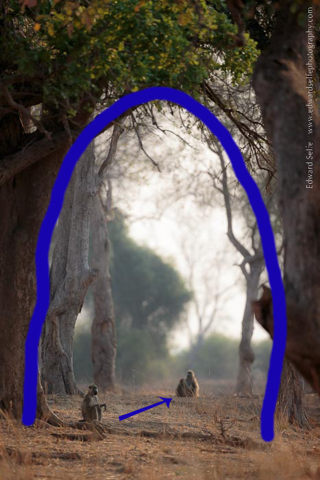 This is an example of using a natural frame to bring interest to a small subject. Three baboons sit in the shade of overhanging trees, which form a pleasing arch. Without the arch, the image would be simply some primates which are too far away to identify!