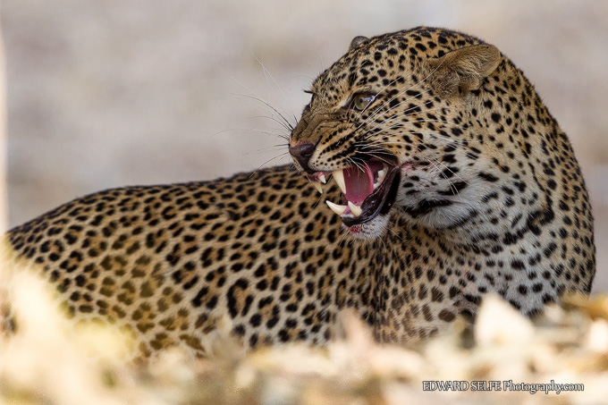I found this yearling female leopard when she had just killed a baboon. We kept well back as their adrenalin levels are very high at such a time, and their behaviour unpredictable. However her mother, an old female, was not so cautious and began to approach the carcass while the youngster was standing over it. Whether she was hoping to share, or to take it back in repayment for all the times she fed her daughter, she misjudged the situation and was presented with this response: