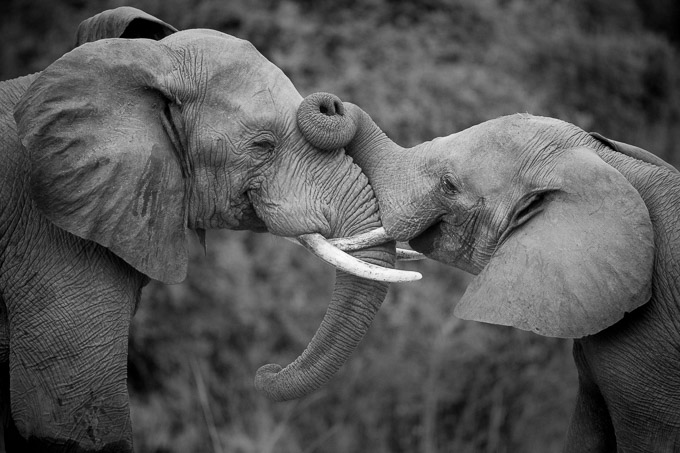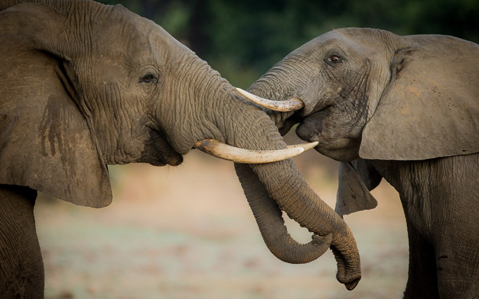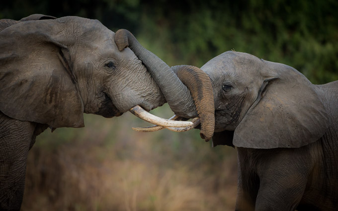 Elephant bulls often wrestle as part of their social interactions. This is usually good-natured, but occasionally turns more serious when bulls are evenly matched and neither feels dominant. There was nothing but gentle play between these two however.
