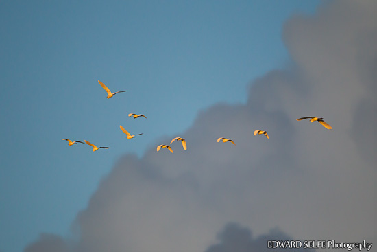 Beautiful evening sky this evening as a group of Cattle Egrets flew past me, lit up as a golden splash against the blue-grey sky.